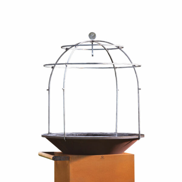 Sa structure en dôme en acier noir se fixe sur le bord extérieur du brasero — la plancha reste entièrement libre. Pendant que vous saisissez sur l’anneau, viandes, poissons, légumes et fruits cuisent lentement suspendus au-dessus des braises, infusés par la chaleur du feu de bois. Deux cuissons simultanées, deux textures, deux univers de saveurs. Et surtout : un visuel qui marque les esprits de vos convives dès l’allumage.
