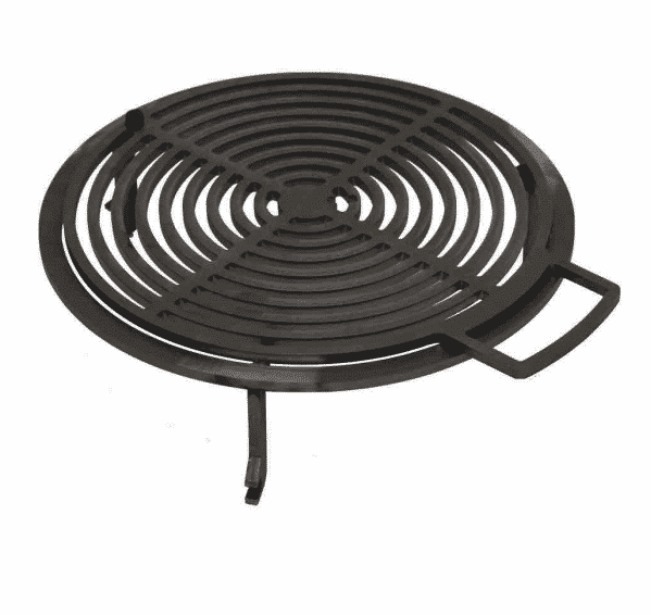 La grille surélevée permet une cuisson directement au centre du foyer du brasero. Elle permet un saisissement rapide des grillades au feu de bois, contrairement à la plaque que vous utilisez comme plancha. La grille a la particularité de pivoter pour rapprocher ou éloigner les aliments du feu. Par ce moyen, vous régulez un peu la chaleur de cuisson.