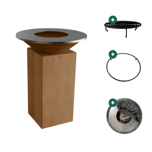 Pack braséro Ofyr 75 en acier corten avec grille barbecue, housse de protection et anneau de maintien.