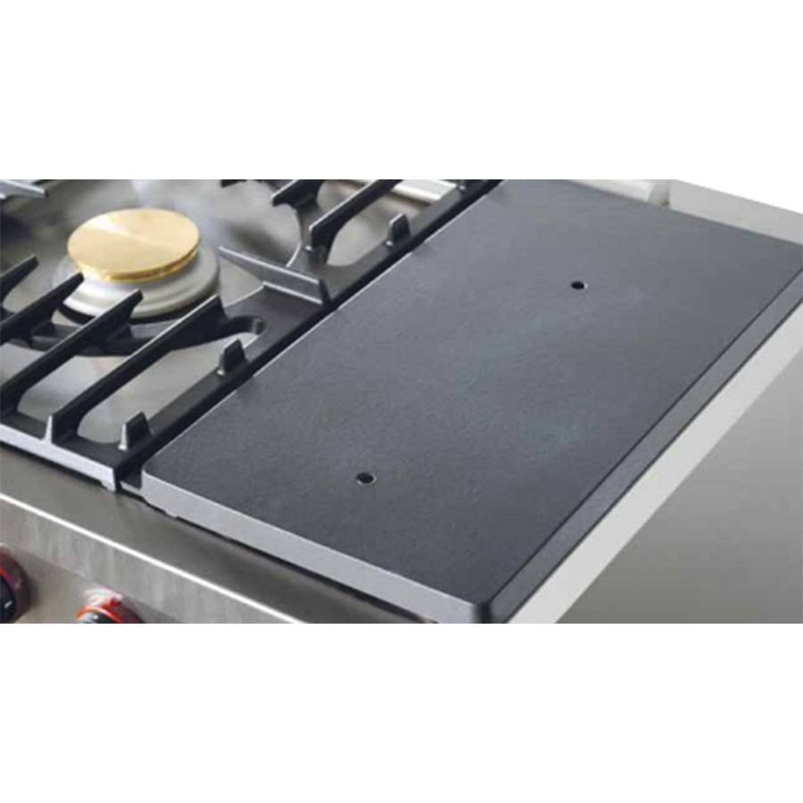 Réalisez de superbes plats mijotés avec cette plaque en fonte de 600 x 500 mm qui vient remplacer le feu vif 5 kW, le brûleur de 1,5 kW et le brûleur de 4 kW à droite de la table.
