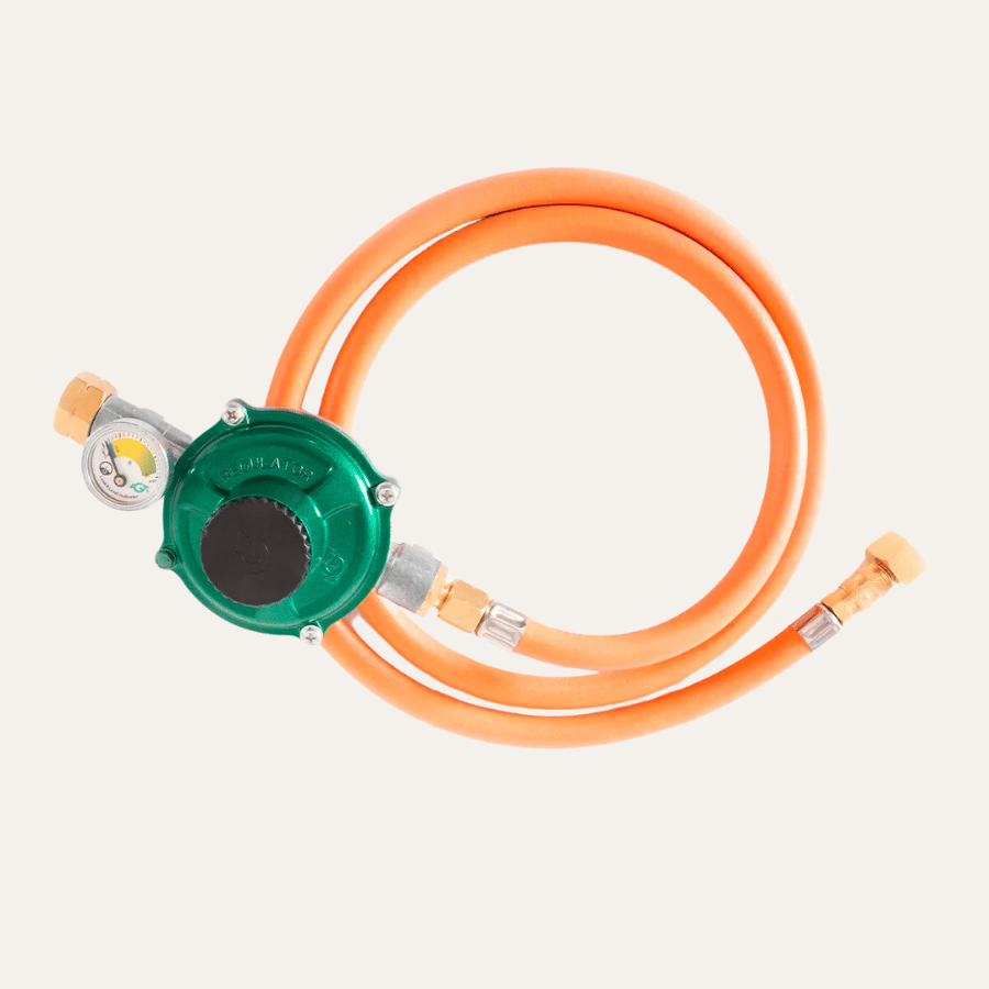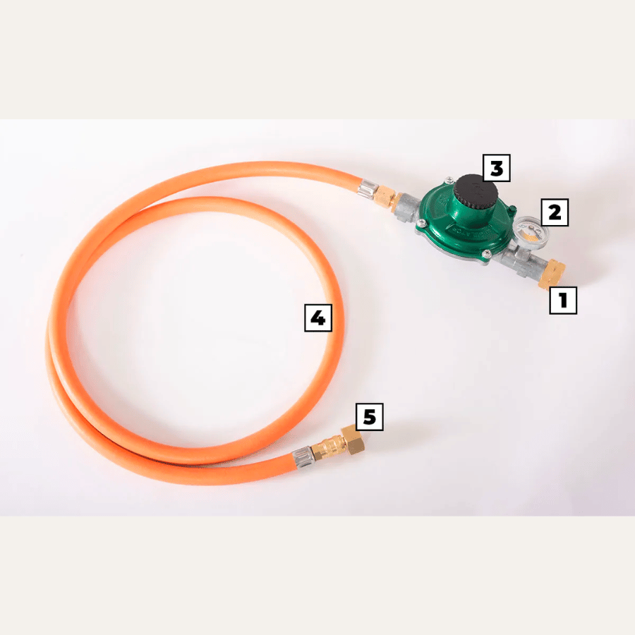 – 1 boulon avec filetage femelle pour bouteille – 1 manomètre pour contrôler la pression du GPL dans la bouteille, avec indicateur de quantité et détection des fuites – 1 régulateur de pression équipé d’un filtre pour éviter l’introduction de corps étrangers contenus dans le gaz – 1 tuyau en caoutchouc certifié – 1 raccord rapide 1/2” certifié pour l’utilisation du gaz, avec partie femelle intégrée sur le tuyau du régulateur de pression et partie mâle à monter sur la rampe du gaz
