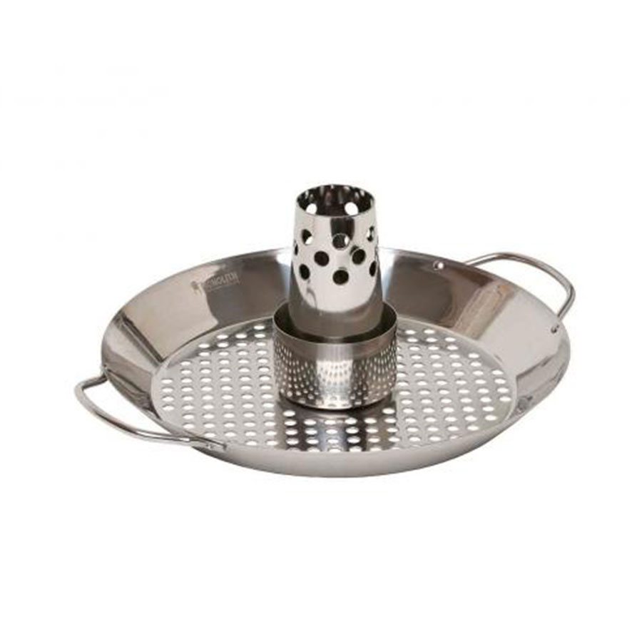 Ustensile en acier inoxydable pour la cuisson du poulet et autres volailles. Support amovible pour remplissage avec divers liquides pour l’infusion de la viande. Poêle perforée idéale pour la cuisson des légumes.